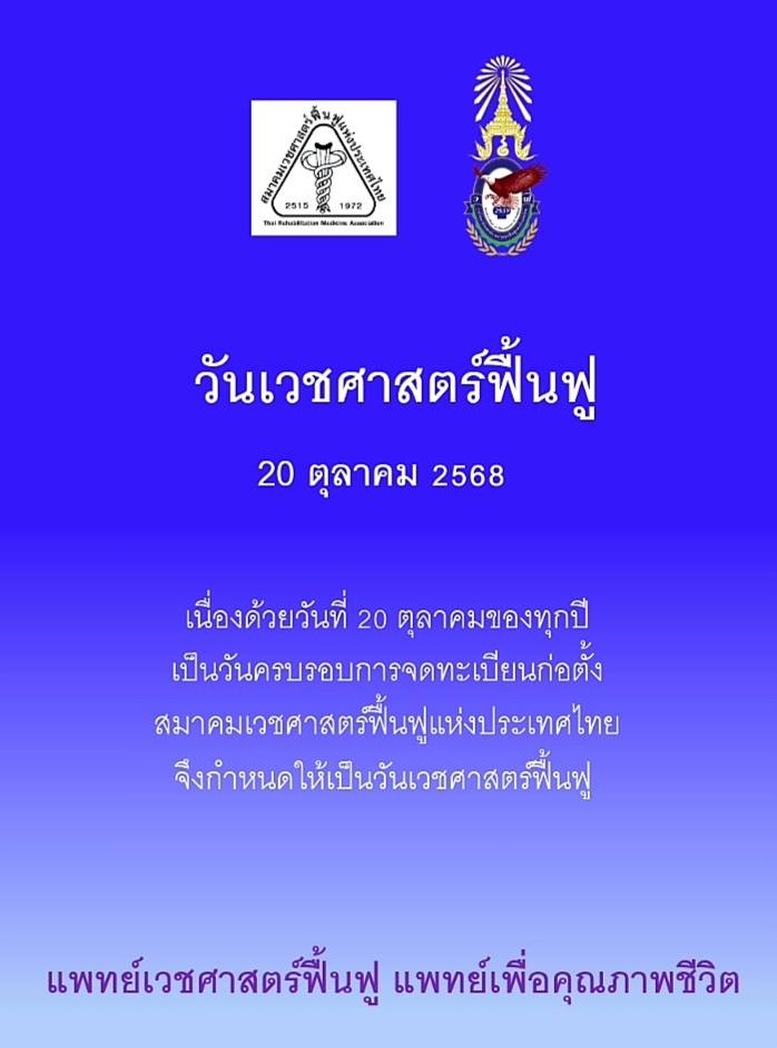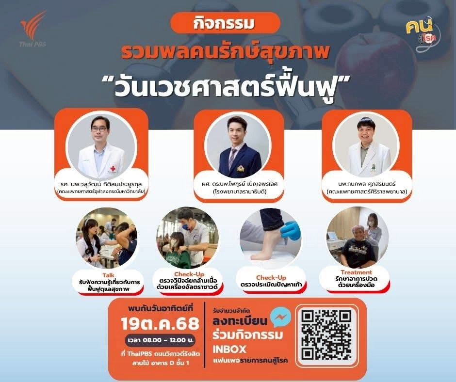 วันอาทิตย์ที่ 19 ตุลาคม 2568 ราชวิทยาลัยแพทย์เวชศาสตร์ฟื้นฟูแห่งประเทศไทย และสมาคมเวชศาสตร์ฟื้นฟูแห่งประเทศไทยจัดกิจกรรมรวมพลคนรักษ์สุขภาพ เนื่องใน “วันเวชศาสตร์ฟื้นฟู”  ณ สถานีไทยพีบีเอส